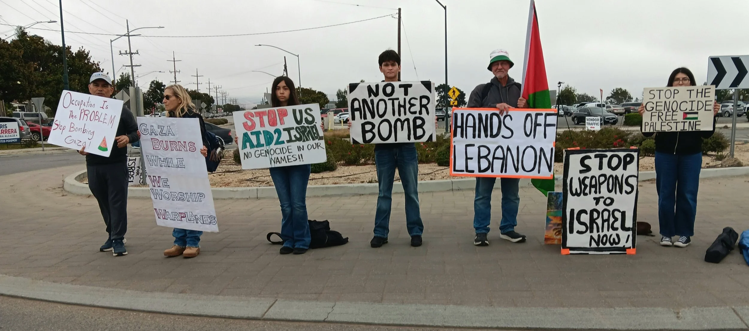 MacGregor Eddy with the group Salinas Palestine Solidarity shared that in Salinas, California on September 28, they held an event called, “Hands off Lebanon, no weapons to Israel.” She writes, “The Salinas Palestine Solidarity is a very new group just forming in response to the slaughter of people by Israel in Gaza, the West Bank, and now Lebanon. We chose to bring our signs to the Salinas Airshow, with jets as entertainment. We were surprised how well it went, very few negative reactions. People want nonviolent solutions. Our signs were saying that the killing must stop, the United States sending of weapons to Israel must stop now. There was surprisingly little negative response from the people going into the airshow to watch military might as entertainment.”